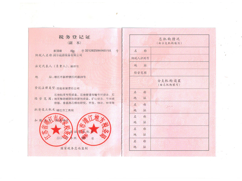 耐爾能源裝備有限公司稅務(wù)登記證